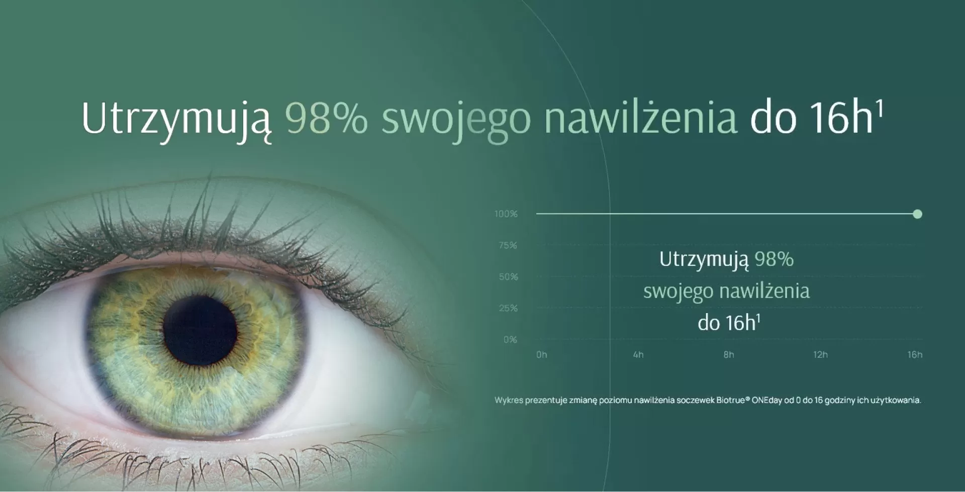 Jednodniowe soczewki kontaktowe Biotrue® ONEday utrzymują 98% swojego nawilżenia do 16 godzin2 Dzięki czemu możesz
